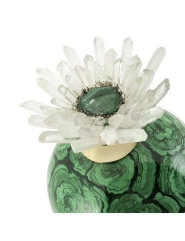 The sphere is crowned with a meticulously crafted rock crystal and natural stones, which enhances the overall aesthetic with its natural beauty and sophisticated allure.