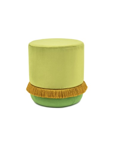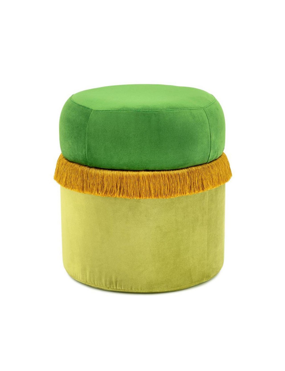 Made in Italy Jellybean pouf is absolutely unique by revealing, in the grandeur of its round lines, an intriguing play between the softness of duo color velvet textures, and flirty dynamic movement of contrasting tone silk fringes.