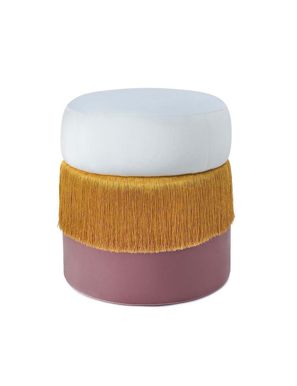 Made in Italy Jellybean pouf is absolutely unique by revealing, in the grandeur of its round lines, an intriguing play between the softness of duo color velvet textures, and flirty dynamic movement of contrasting tone silk fringes.