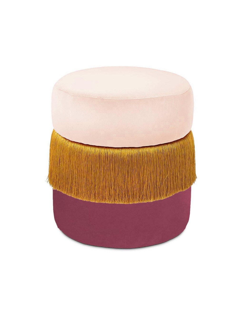 Made in Italy Jellybean pouf is absolutely unique by revealing, in the grandeur of its round lines, an intriguing play between the softness of duo color velvet textures, and flirty dynamic movement of contrasting tone silk fringes.