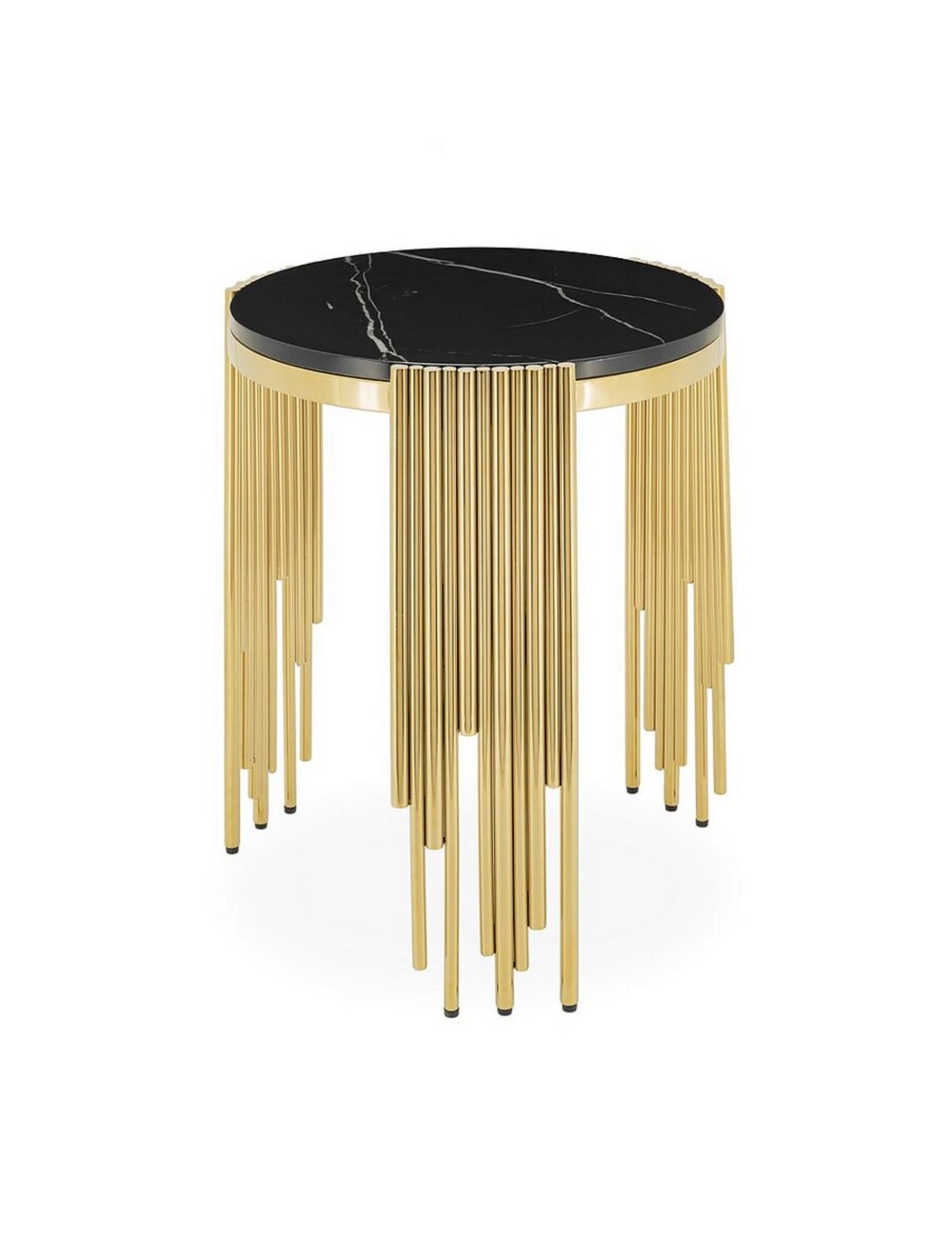 The side table Scotch features a black marble top with a soft white veining, paired with a base of cascading gold rods. This combination of materials creates a sleek and modern look, making it a versatile addition to any room. Whether used next to a sofa or as an accent piece, this side table adds a touch of luxury without overpowering the space. Its clean design and contrasting materials make it a standout piece in any setting. Perfect when paired with other items from the same Scotch collection.
