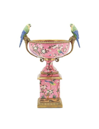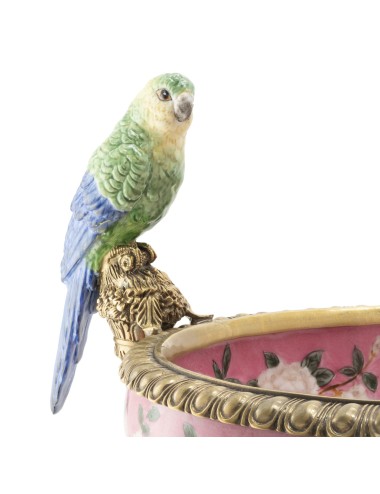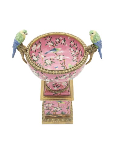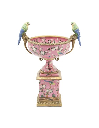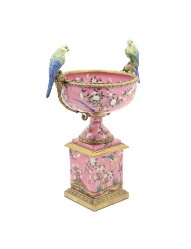 Porcelain cup on base with hand painted floral and bird motif decor, handmade details in bronze.